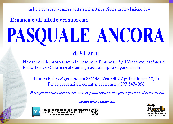 Alla famiglia Ancora condividiamo il vostro dolore per la perdita di Pasquale che ricorderemo sempre con affetto e simpatia vi siamo vicini un abbraccio da famiglia Fracassi e Zanini